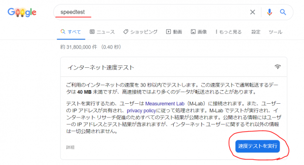 ご自宅の通信環境について把握れさておられますか。Webミーティングの際に必要な速度を確保できているかの確認が必要です。Googleで「スピードテスト」と検索すると簡単に速度計測ができます。ここで下り10Mbps以下の速度が常態化しているような回線であればぜひ環境を見直してください。速度は一定のものではないので、時間帯を変えて何度か測ってみることをオススメします。日中は速度が出ていても、近隣の住民が帰ってくる夜になると速度が落ちるお宅は沢山あります。