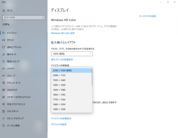 ちなみに、上記設定画面で解像度を下げることは可能ですが、仕様として決まっているもの以上に挙げることは当然できません。また、「文字やアイコンが小さすぎる」と感じたときに解像度を下げた場合の見え方(ボケやにじみなど)は、機種により大きく異なりますので、ぜひ購入前にご自身の目で確かめてみてください。